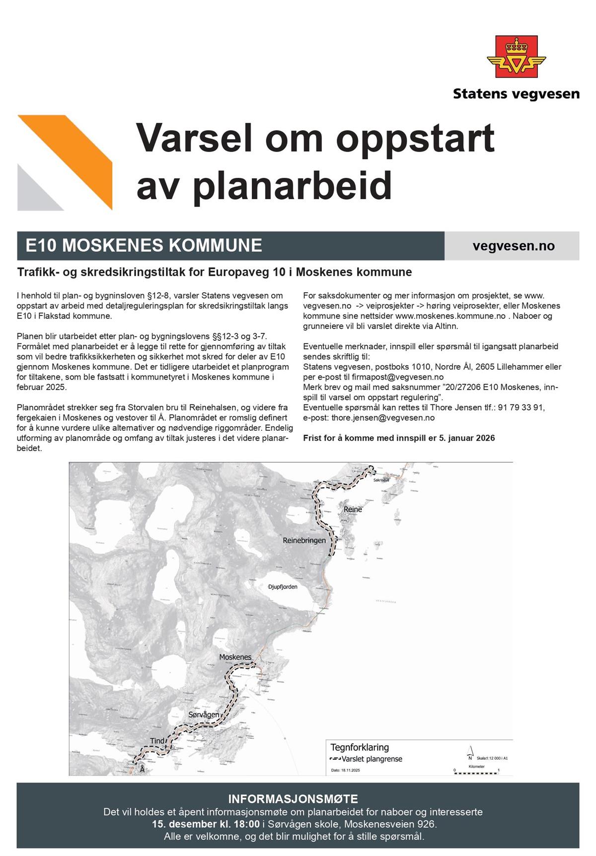 Åpent informasjonsmøte Statens Vegvesen 15. desemberINFORMASJONSMØTEDet vil holdes et åpent informasjonsmøte om planarbeidet for naboer og interesserte15. desember kl. 18:00 i Sørvågen skole, Moskenesveien 926 Sist endret 05.12.2025 15.07